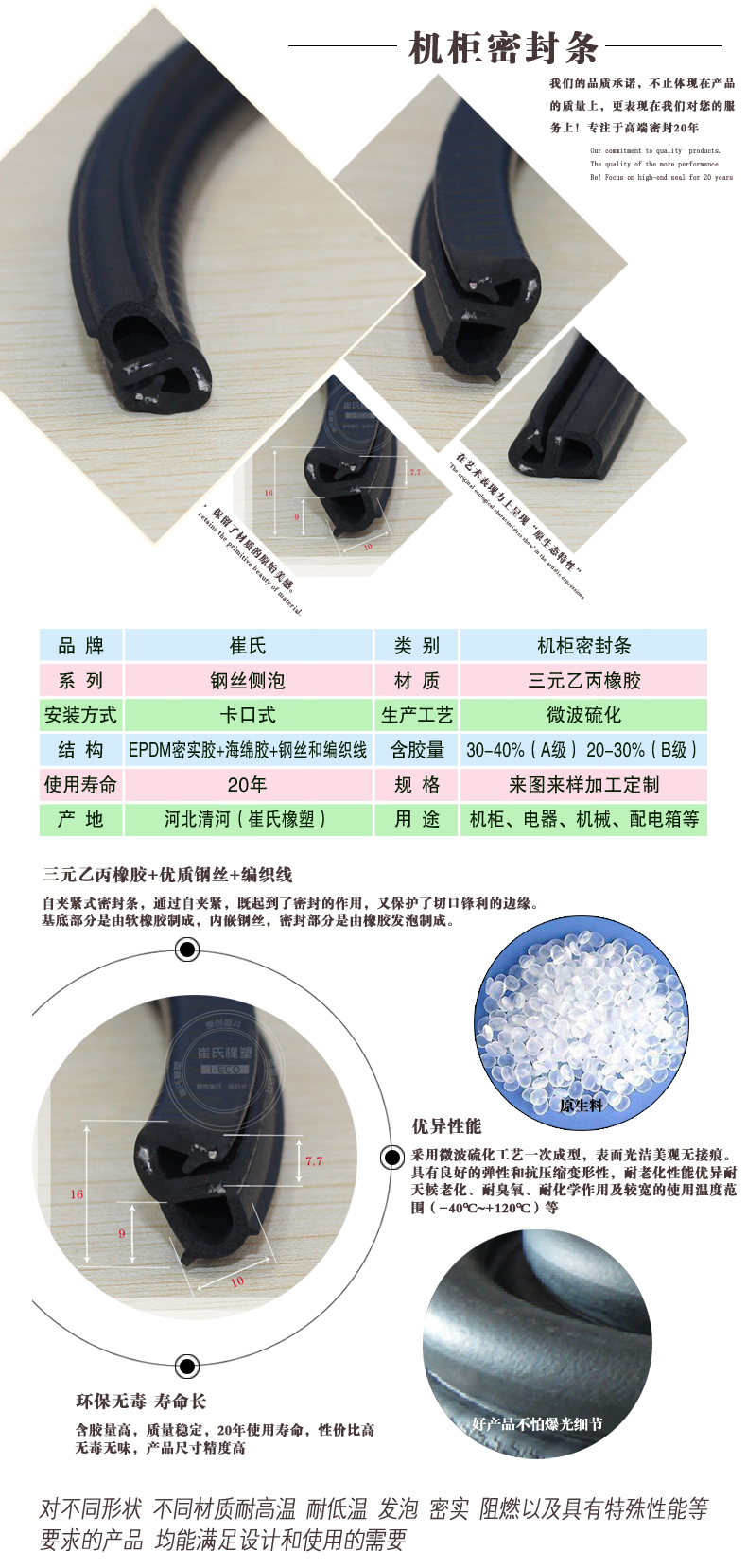 該產品是三元乙丙橡膠經過密煉、擠出、微波加熱一次擠壓成型等工藝制作而成,使用年限長。具有優異的耐天候、耐臭氧、耐熱、耐酸堿、耐水蒸汽、顏色穩定性、電性能、充油性及常溫流動性。