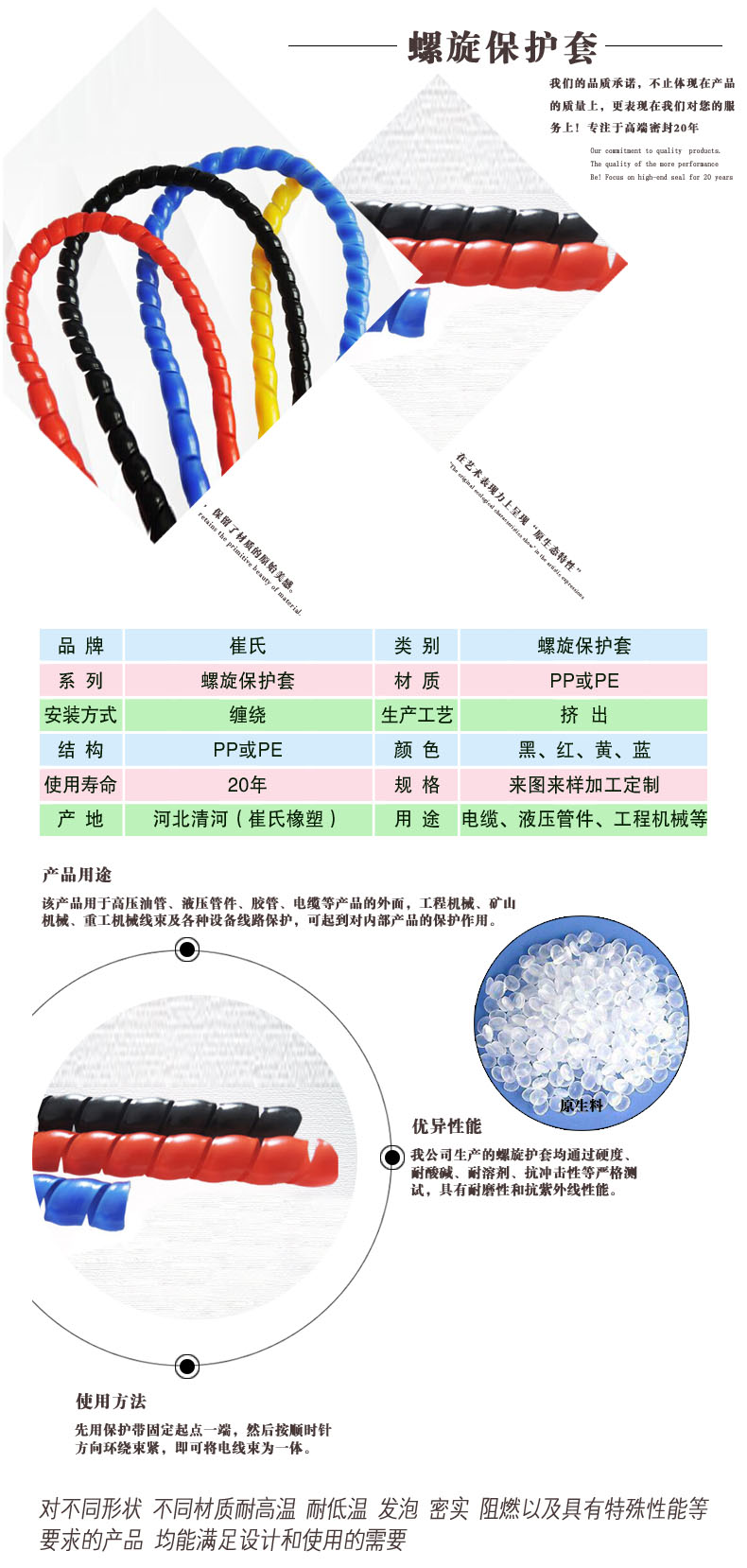 螺旋保護套為螺旋狀,具有很好的彈力、拉伸力,可以對液壓膠管、電線、電纜等內部產品起到很好的束縛作用。目前國內采用的原材料為聚丙烯(PP)、聚乙烯(PE)或尼龍(PA),使產品具有很好的耐磨作用。此外,螺旋保護套還具有良好的耐高低溫、耐油、抗紫外線、抗靜電、抗沖擊、抗拉伸等性能。