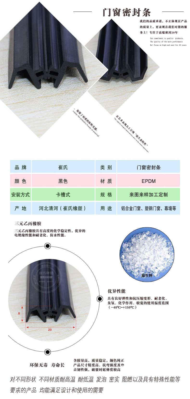 河北崔氏橡塑制品科技有限公司,具有經驗豐富的技術人員,專業的研發團隊,優質的服務,大批量供應,產品通過國際質量認證,價格合理,供貨迅速。我公司將根據客戶的來樣或圖紙進行開發訂做,也可根據型材口型進行研發。我公司將全程為廣大客戶解決產品的技術問題,并鄭重承諾如出現任何質量問題將無條件退貨。
