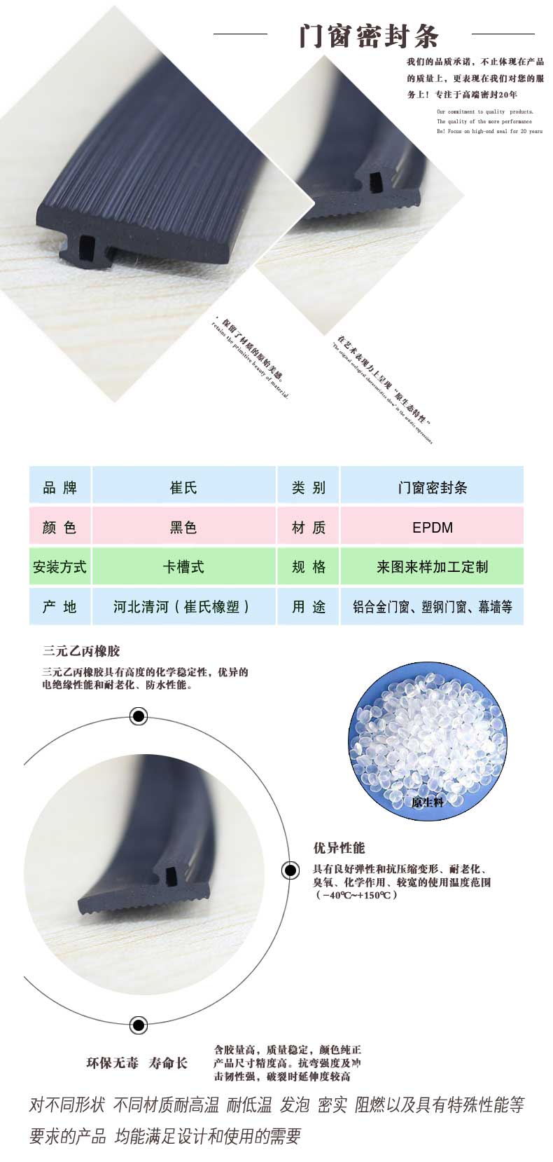 河北崔氏橡塑制品科技有限公司,具有經驗豐富的技術人員,專業的研發團隊,優質的服務,大批量供應,產品通過國際質量認證,價格合理,供貨迅速。我公司將根據客戶的來樣或圖紙進行開發訂做,也可根據型材口型進行研發。我公司將全程為廣大客戶解決產品的技術問題,并鄭重承諾如出現任何質量問題將無條件退貨。