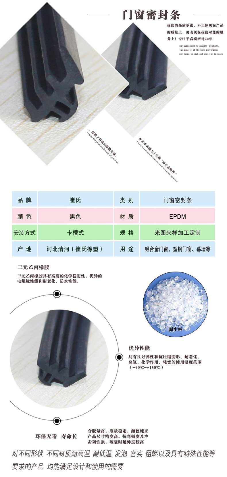 河北崔氏橡塑制品科技有限公司,具有經(jīng)驗豐富的技術(shù)人員,專業(yè)的研發(fā)團(tuán)隊,優(yōu)質(zhì)的服務(wù),大批量供應(yīng),產(chǎn)品通過國際質(zhì)量認(rèn)證,價格合理,供貨迅速。我公司將根據(jù)客戶的來樣或圖紙進(jìn)行開發(fā)訂做,也可根據(jù)型材口型進(jìn)行研發(fā)。我公司將全程為廣大客戶解決產(chǎn)品的技術(shù)問題,并鄭重承諾如出現(xiàn)任何質(zhì)量問題將無條件退貨。