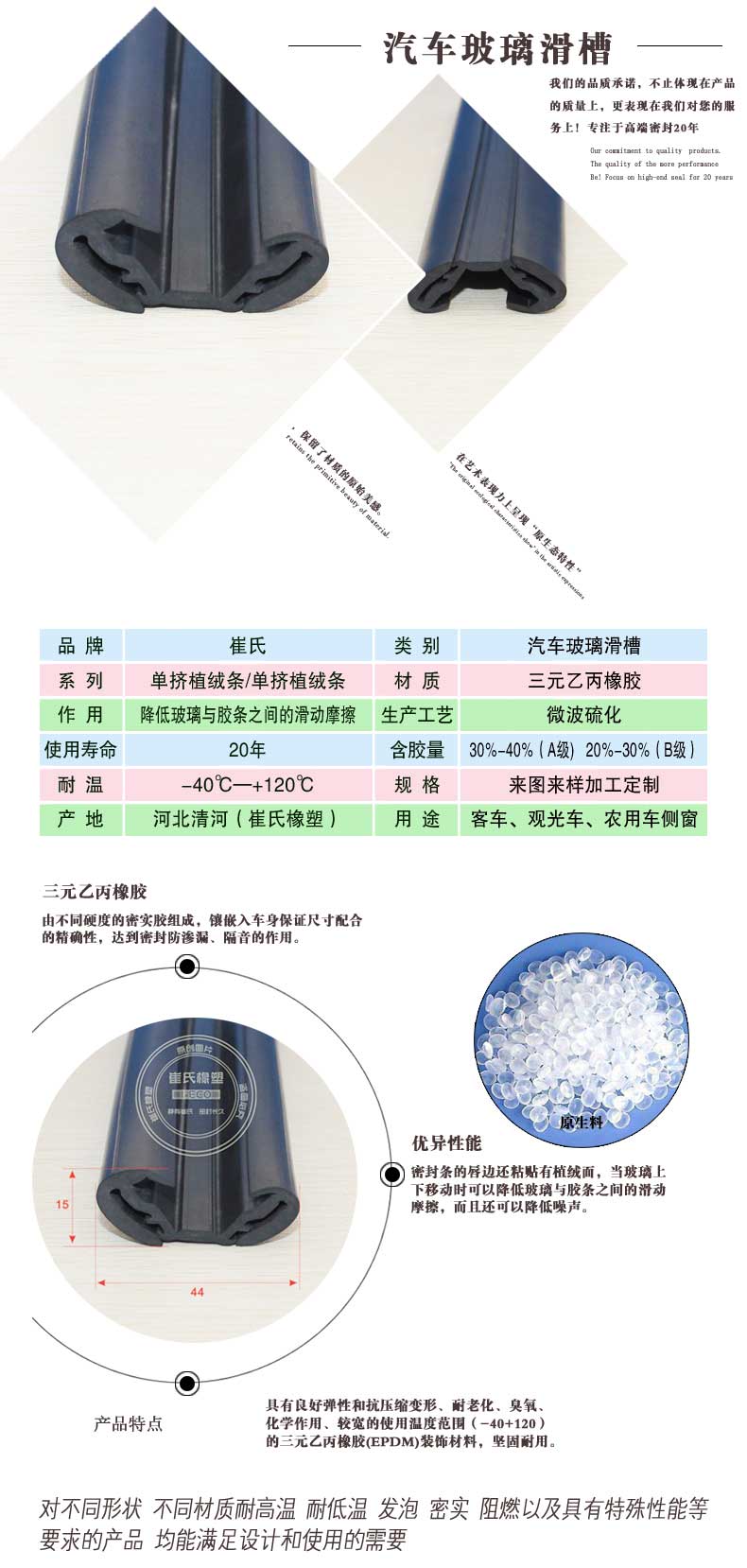 崔氏生產的車窗玻璃導槽密封條由不同硬度的密實膠組成,鑲嵌入車身保證尺寸配合的精確性,達到密封防滲漏、隔音的作用。密封條的唇邊還粘貼有植絨面,當玻璃上下移動時可以降低玻璃與膠條之間的滑動摩擦,而且還可以降低噪聲。這種密封條形式也用于天窗密封條。
