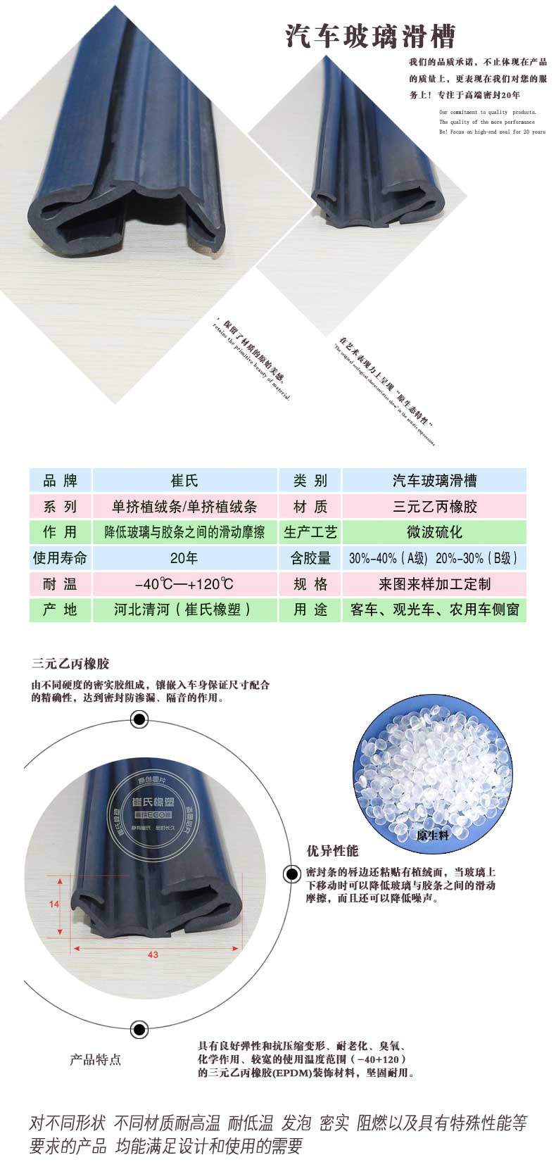 崔氏生產的車窗玻璃導槽密封條由不同硬度的密實膠組成,鑲嵌入車身保證尺寸配合的精確性,達到密封防滲漏、隔音的作用。密封條的唇邊還粘貼有植絨面,當玻璃上下移動時可以降低玻璃與膠條之間的滑動摩擦,而且還可以降低噪聲。這種密封條形式也用于天窗密封條。