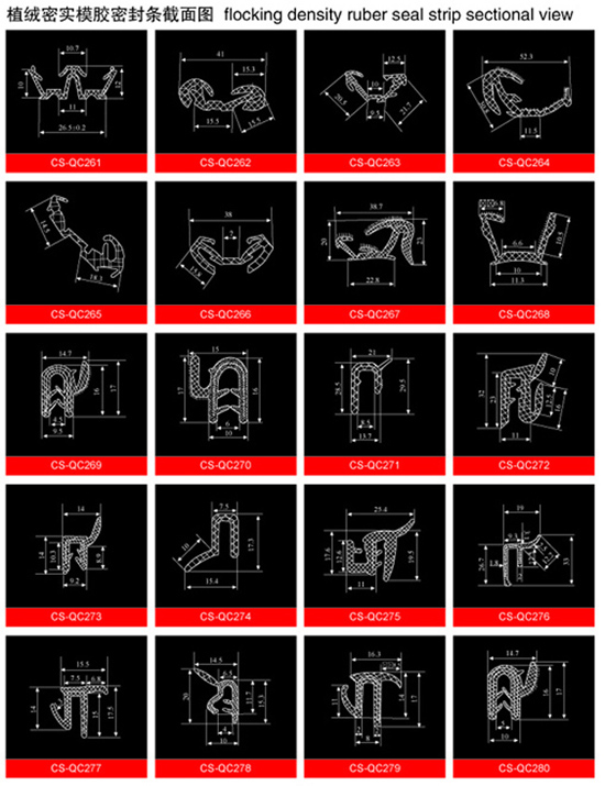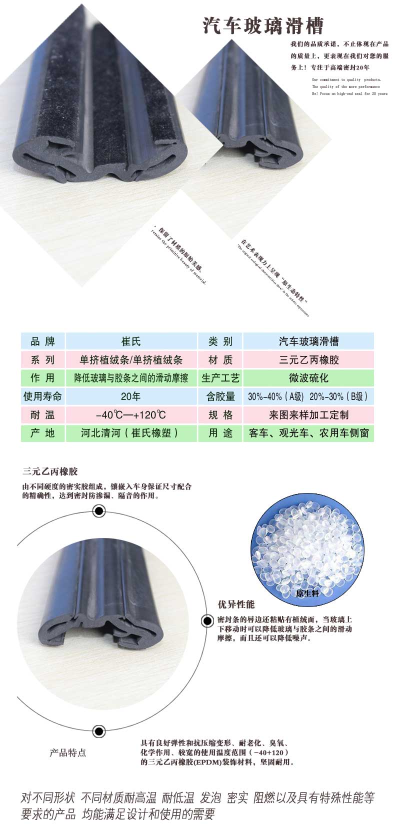 崔氏生產的車窗玻璃導槽密封條由不同硬度的密實膠組成,鑲嵌入車身保證尺寸配合的精確性,達到密封防滲漏、隔音的作用。密封條的唇邊還粘貼有植絨面,當玻璃上下移動時可以降低玻璃與膠條之間的滑動摩擦,而且還可以降低噪聲。這種密封條形式也用于天窗密封條。