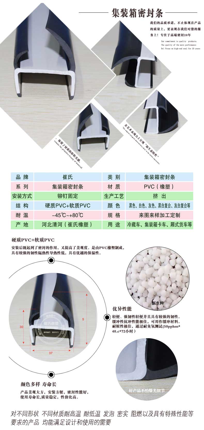 崔氏集裝箱密封條使用環境溫度為-45℃~+80℃,通常采用PVC材質進行生產,正常條件下,使用壽命不少于5年