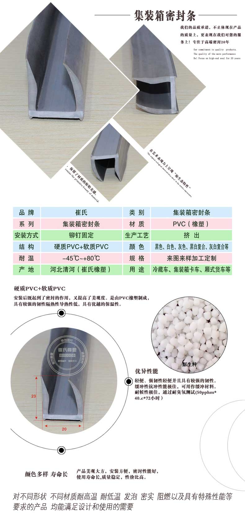 崔氏集裝箱密封條使用環境溫度為-45℃~+80℃,通常采用PVC材質進行生產,正常條件下,使用壽命不少于5年