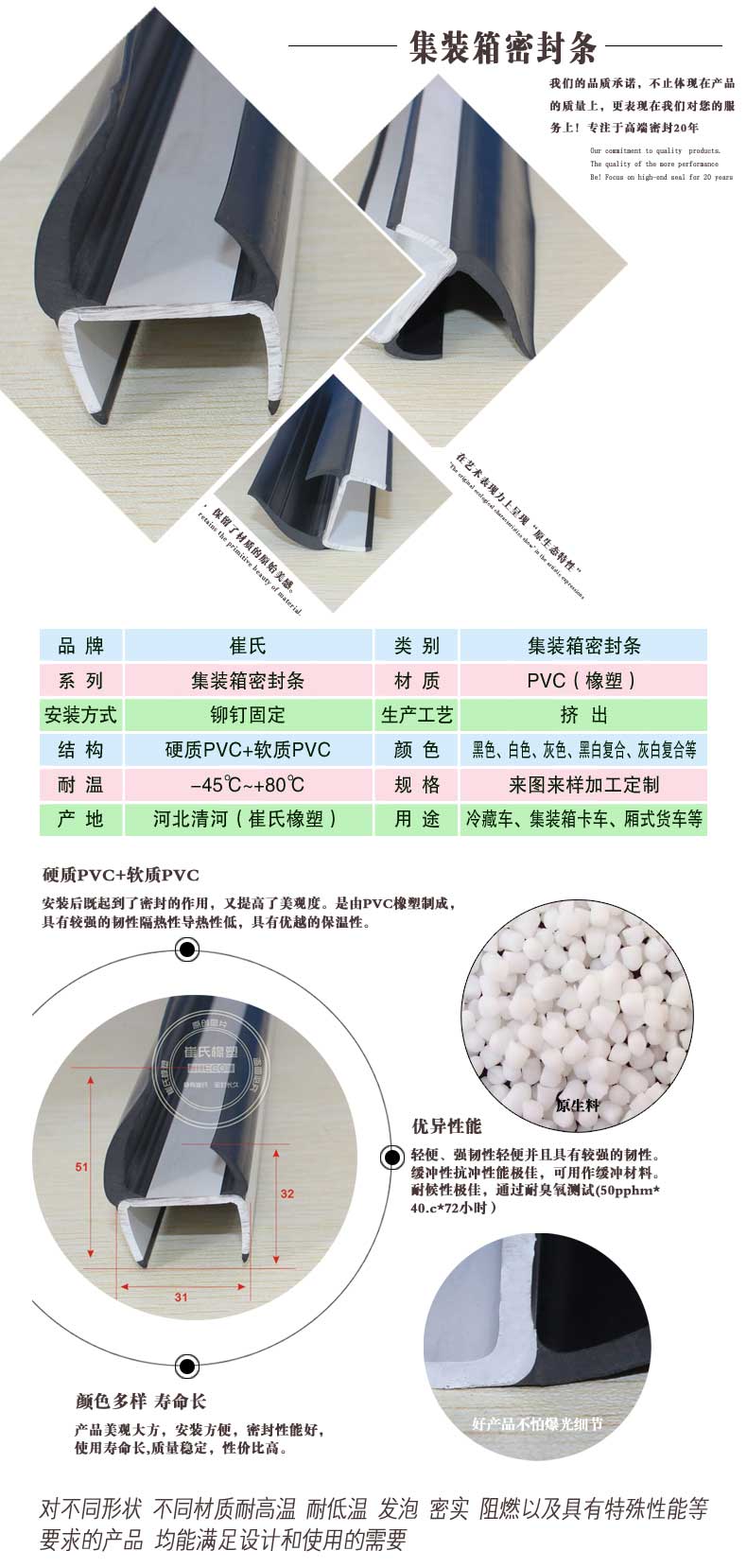 崔氏集裝箱密封條使用環境溫度為-45℃~+80℃,通常采用PVC材質進行生產,正常條件下,使用壽命不少于5年
