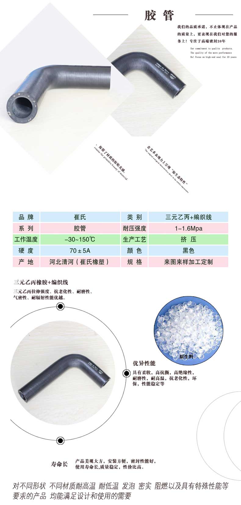 用 以輸送氣體、液體、漿狀或粒狀物料的一類管狀橡膠制品。由內外膠層和骨架層組成,骨架層的材料可用棉纖維、各種合成纖維、碳纖維或石棉、鋼絲等。一般膠管 的內外膠層材料采用天然橡膠、丁苯橡膠或順丁橡膠;耐油膠管采用氯丁橡膠、丁腈橡膠;耐酸堿,耐高溫膠管采用乙丙橡膠、氟橡膠或硅橡膠等。