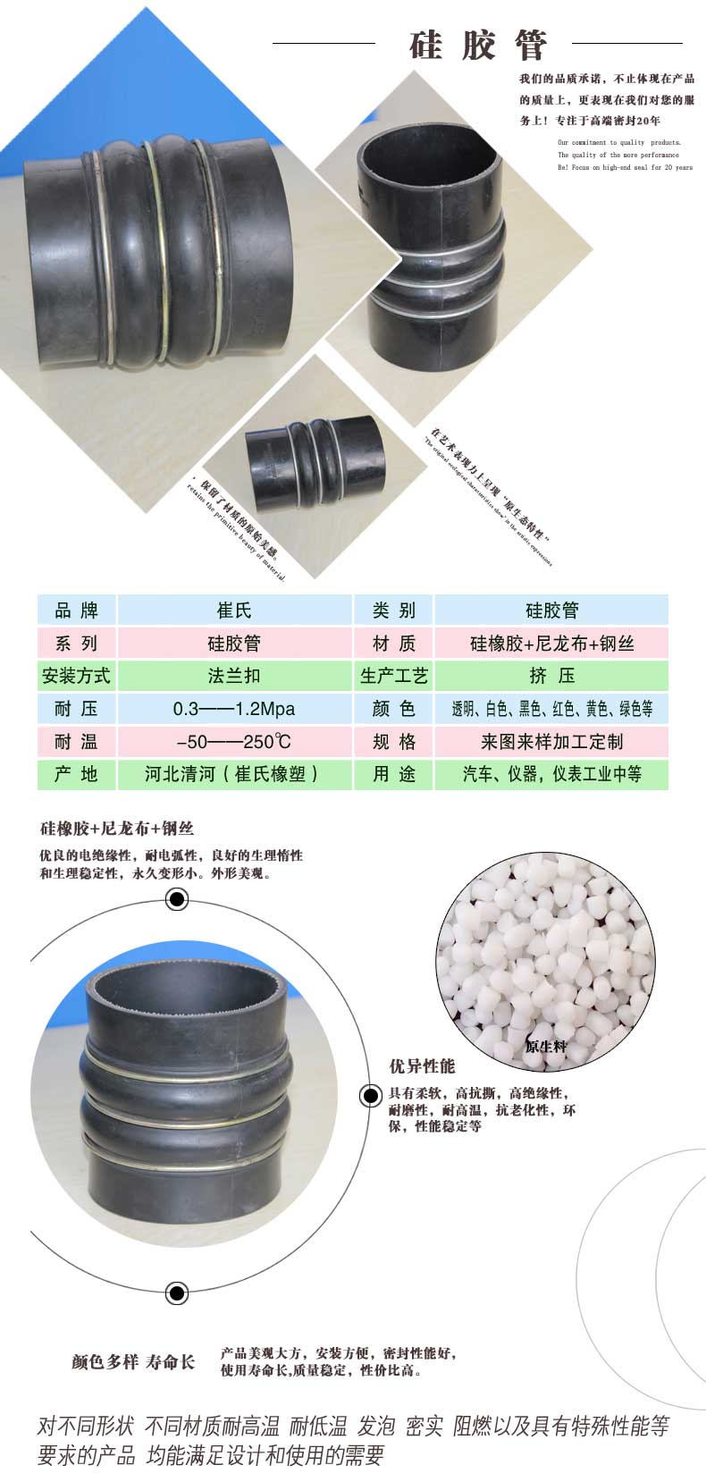 采用專業的耐高低溫硅膠原材料制成,主要用于高溫高壓等特殊環境作業,類似的特殊環境用途硅膠管還有編織(增強)硅膠管、硅膠復合管等產品
