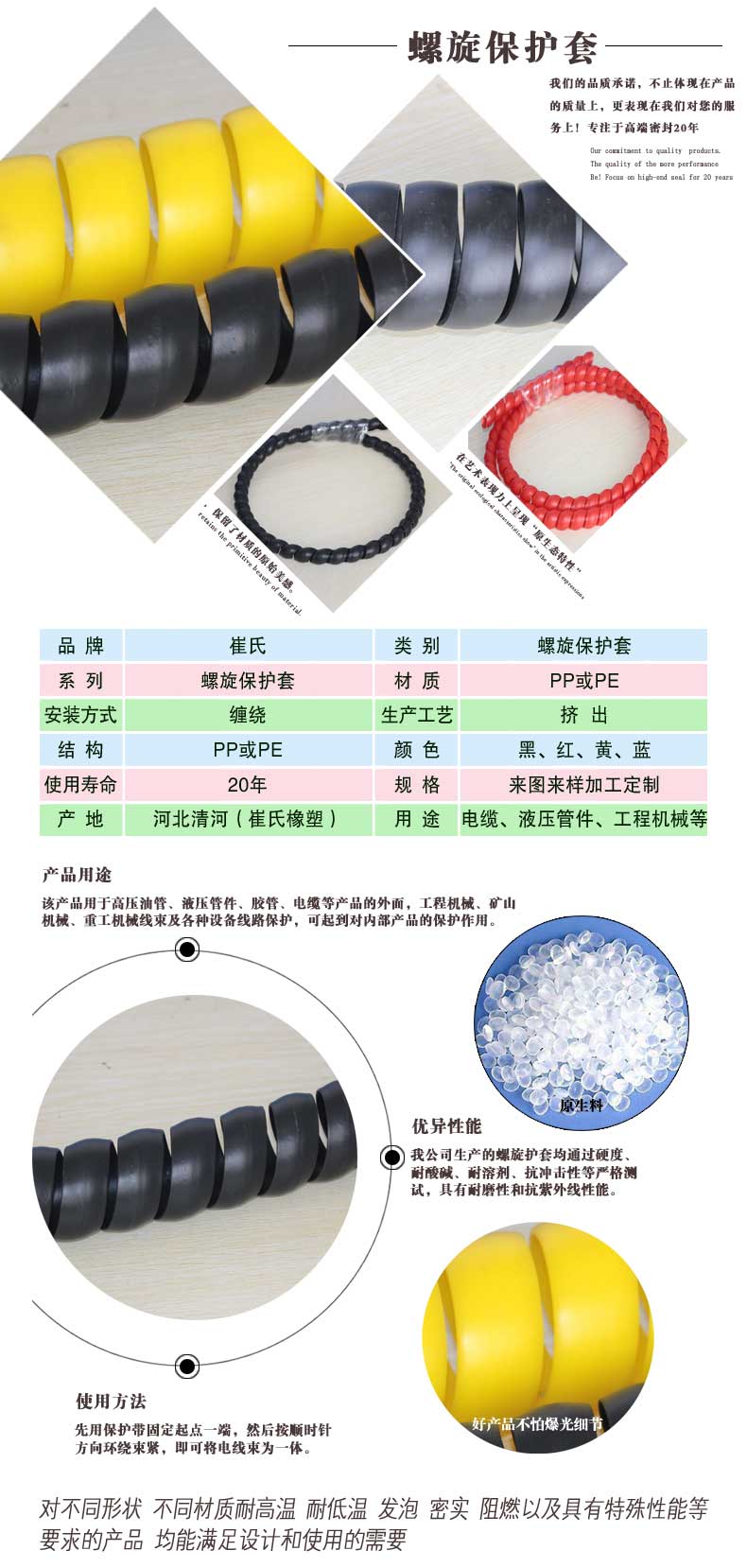 螺旋保護套為螺旋狀,具有很好的彈力、拉伸力,可以對液壓膠管、電線、電纜等內部產品起到很好的束縛作用。目前國內采用的原材料為聚丙烯(PP)、聚乙烯(PE)或尼龍(PA),使產品具有很好的耐磨作用。此外,螺旋保護套還具有良好的耐高低溫、耐油、抗紫外線、抗靜電、抗沖擊、抗拉伸等性能。