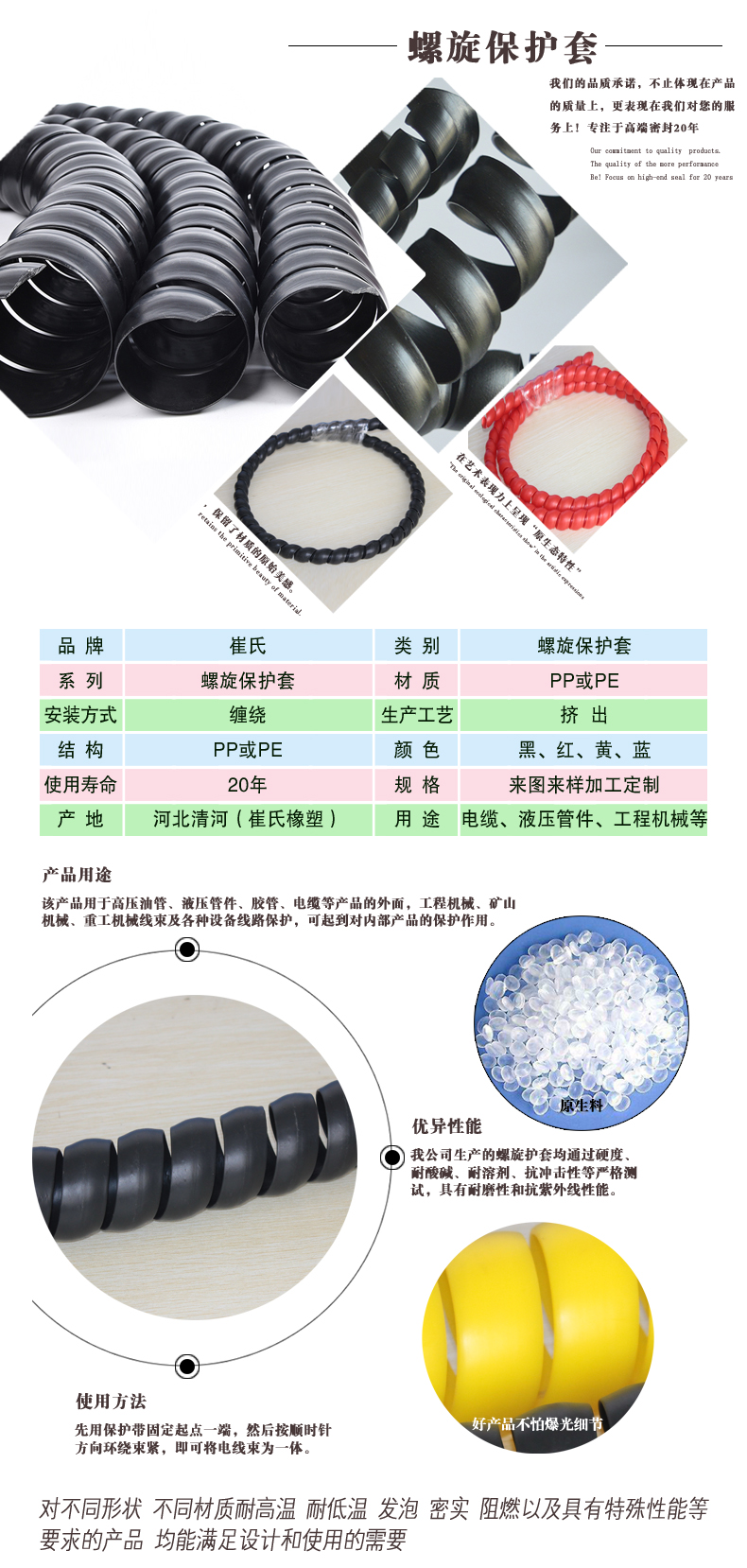 螺旋保護套為螺旋狀,具有很好的彈力、拉伸力,可以對液壓膠管、電線、電纜等內部產品起到很好的束縛作用。目前國內采用的原材料為聚丙烯(PP)、聚乙烯(PE)或尼龍(PA),使產品具有很好的耐磨作用。此外,螺旋保護套還具有良好的耐高低溫、耐油、抗紫外線、抗靜電、抗沖擊、抗拉伸等性能。