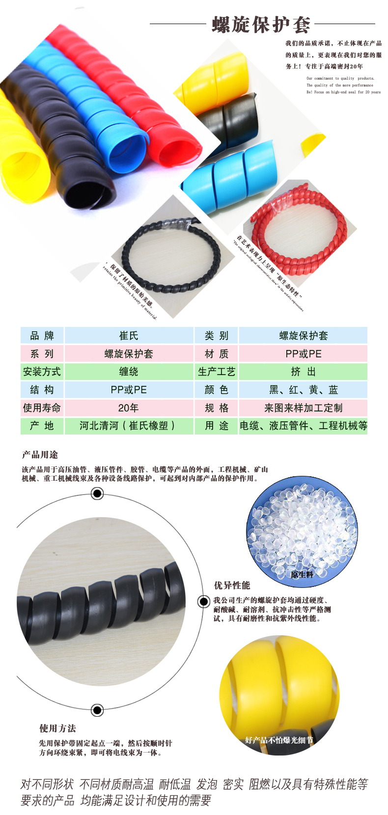 螺旋保護套為螺旋狀,具有很好的彈力、拉伸力,可以對液壓膠管、電線、電纜等內部產品起到很好的束縛作用。目前國內采用的原材料為聚丙烯(PP)、聚乙烯(PE)或尼龍(PA),使產品具有很好的耐磨作用。此外,螺旋保護套還具有良好的耐高低溫、耐油、抗紫外線、抗靜電、抗沖擊、抗拉伸等性能。
