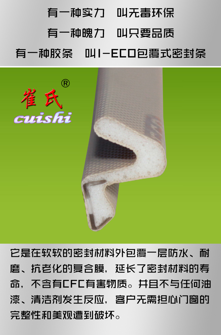 窗要開,不過門窗平時就要密封嚴(yán),如密封不嚴(yán),霧霾天進霾,沙塵天進沙,下雨天進水。都是因為密封不嚴(yán)導(dǎo)致,崔氏I-ECO包覆式密封條門窗密封專家,為您解決一切門窗密封問題,歡迎電話咨詢:400-0329-345